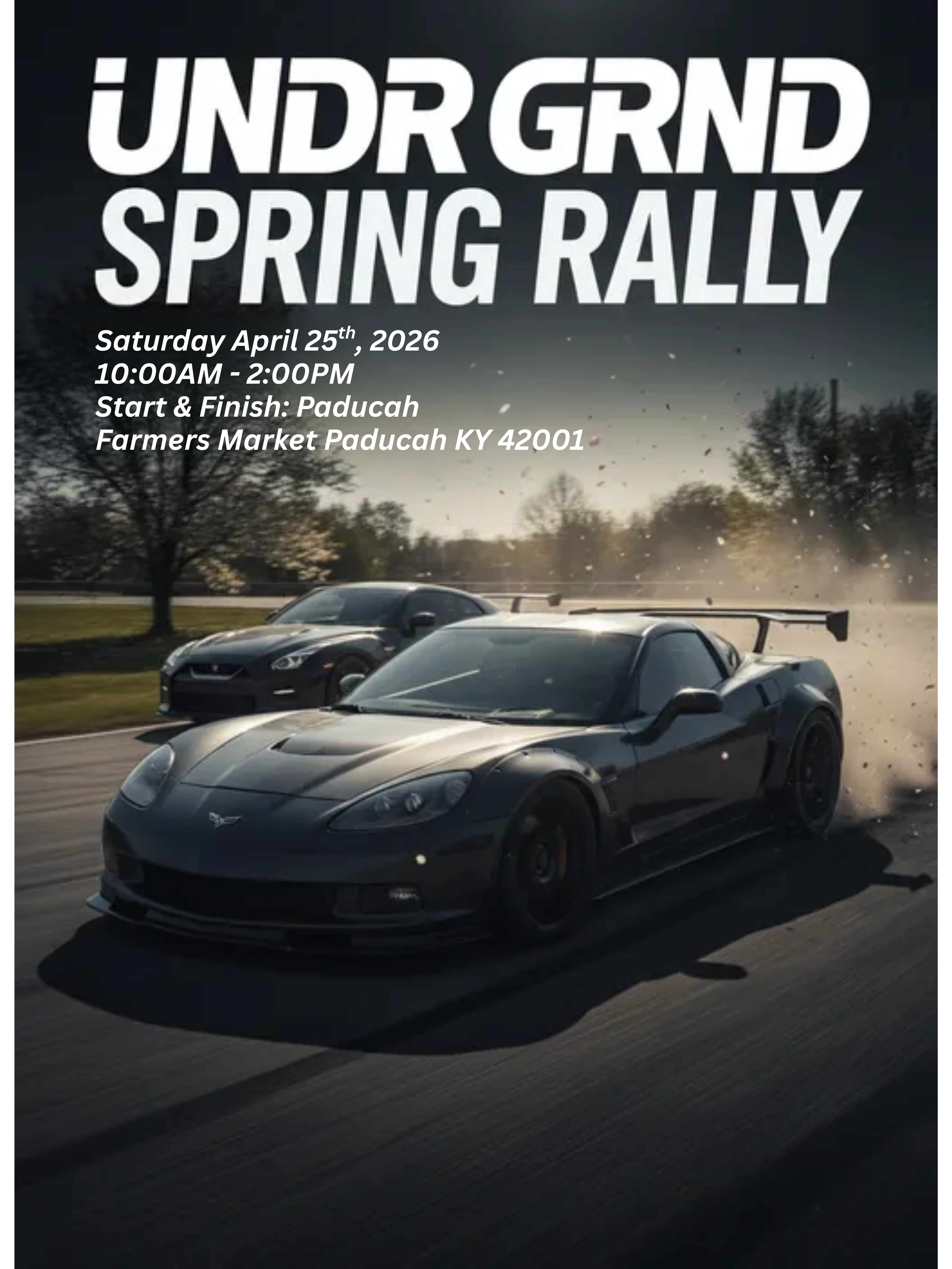 A free social rally on April 25th, 2026, featuring a 3–4 hour cruise with photo stops, media coverage, and a chill meet at the Paducah Farmers Market. Open to anyone with a semi-nice car—this is a cruise, not a race.